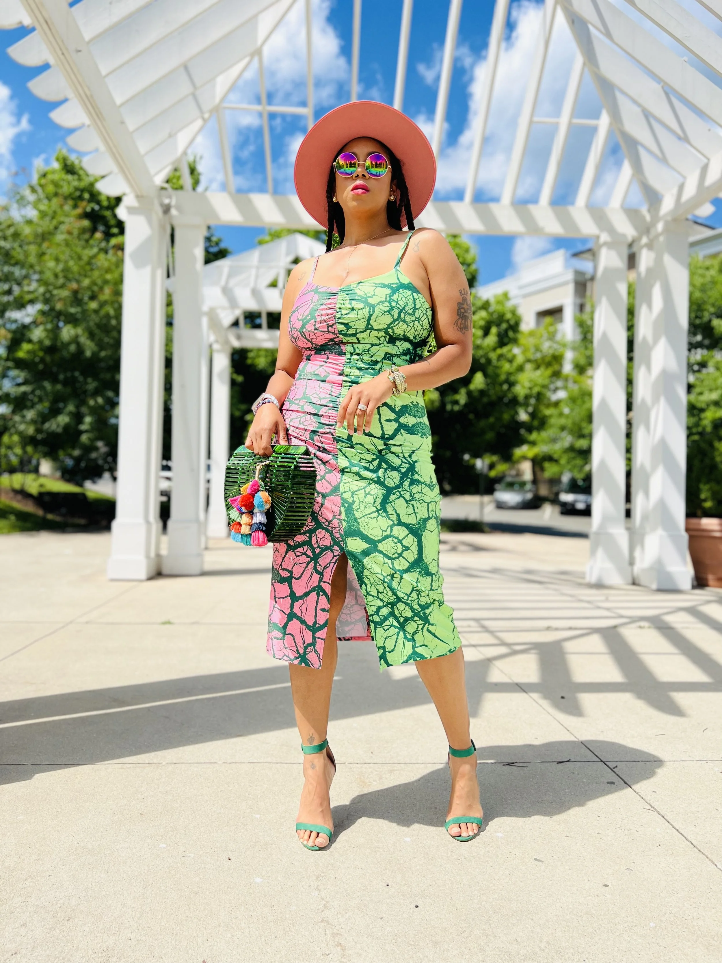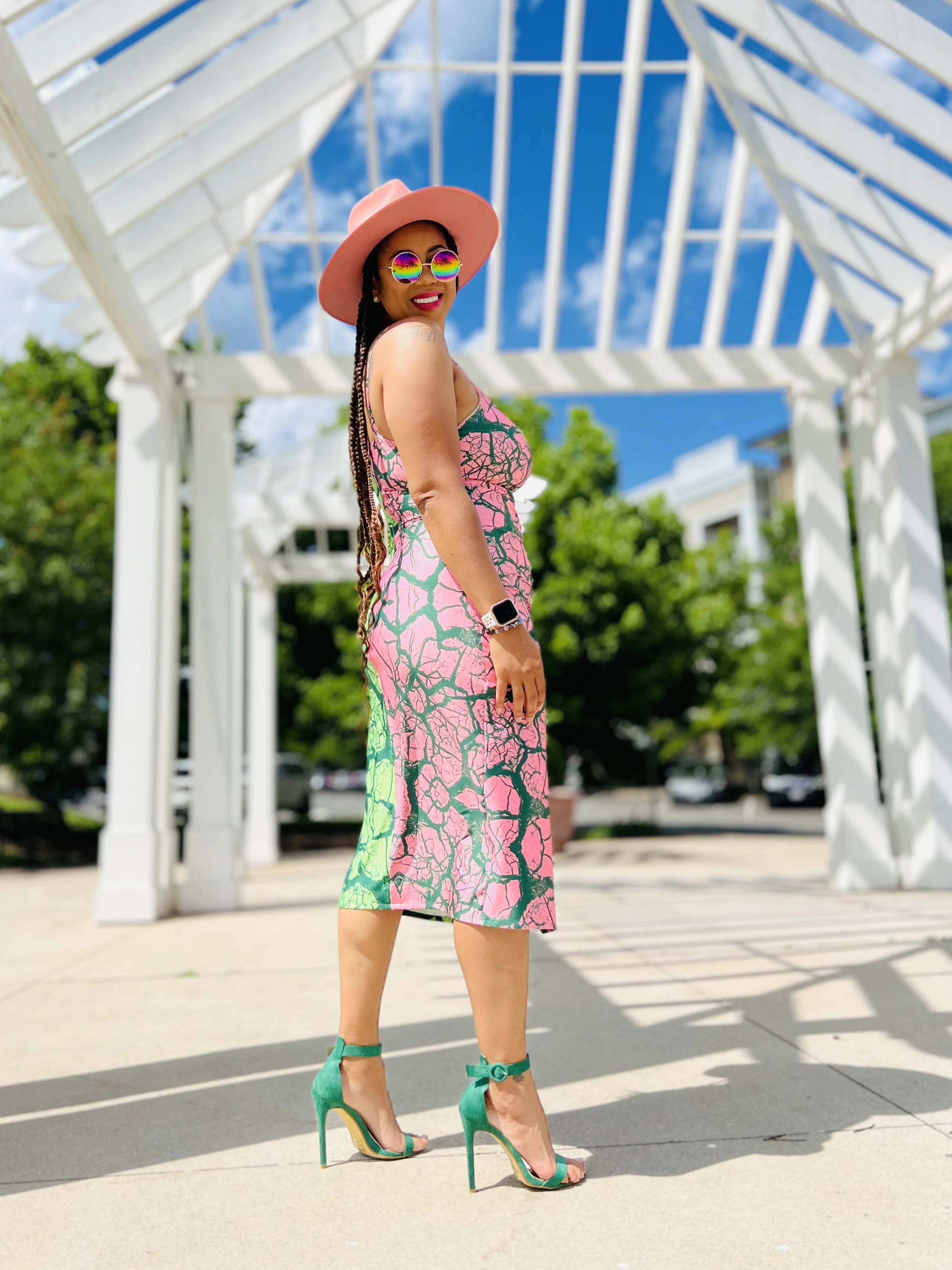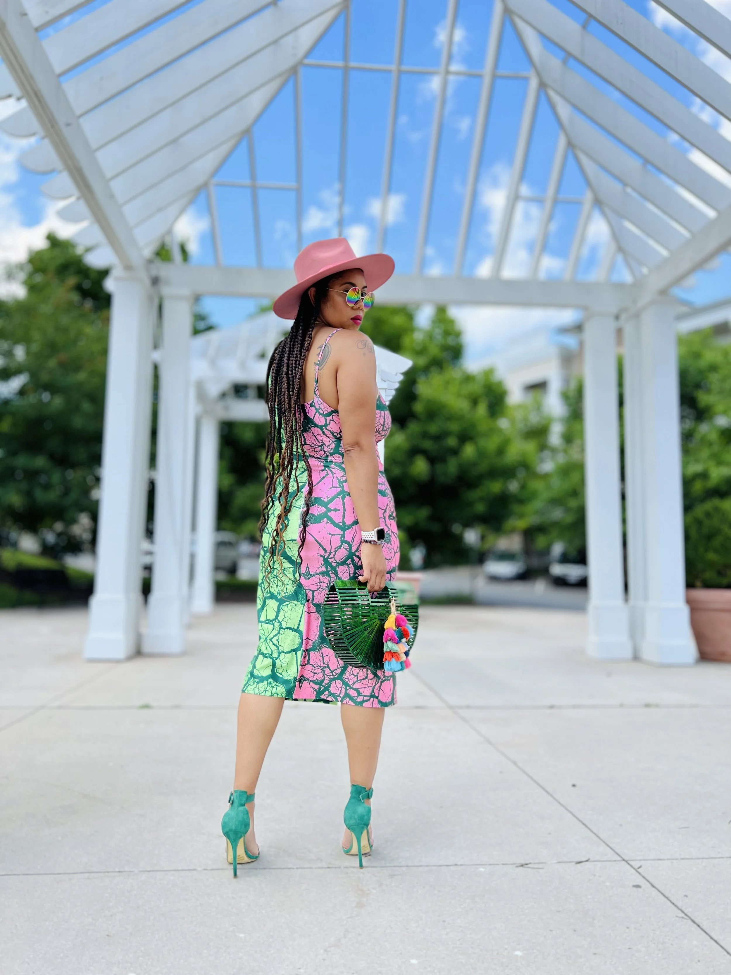 For my first project I went with the Mimi G Simplicity pattern 8639 and Spoonflower Sport Lycra. While sport lycra is most used for swimwear, I love to also create dresses and activewear with this fabric. I used a strong power mesh lining for the bodice portion of the dress and a lighter weight mesh for the skirt. Overall the dress hugs my curves very nicely if I might say so myself.